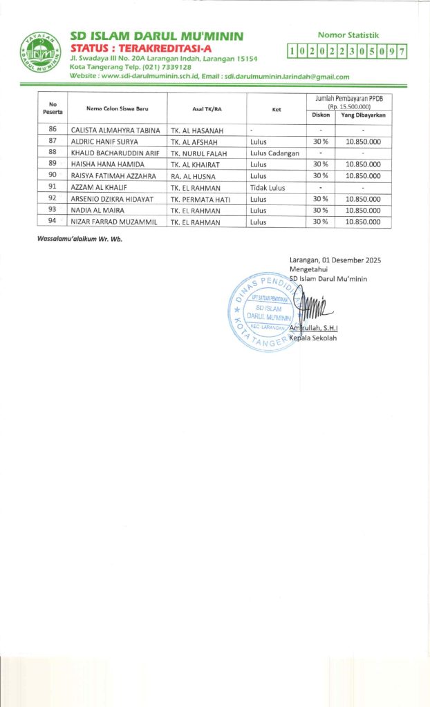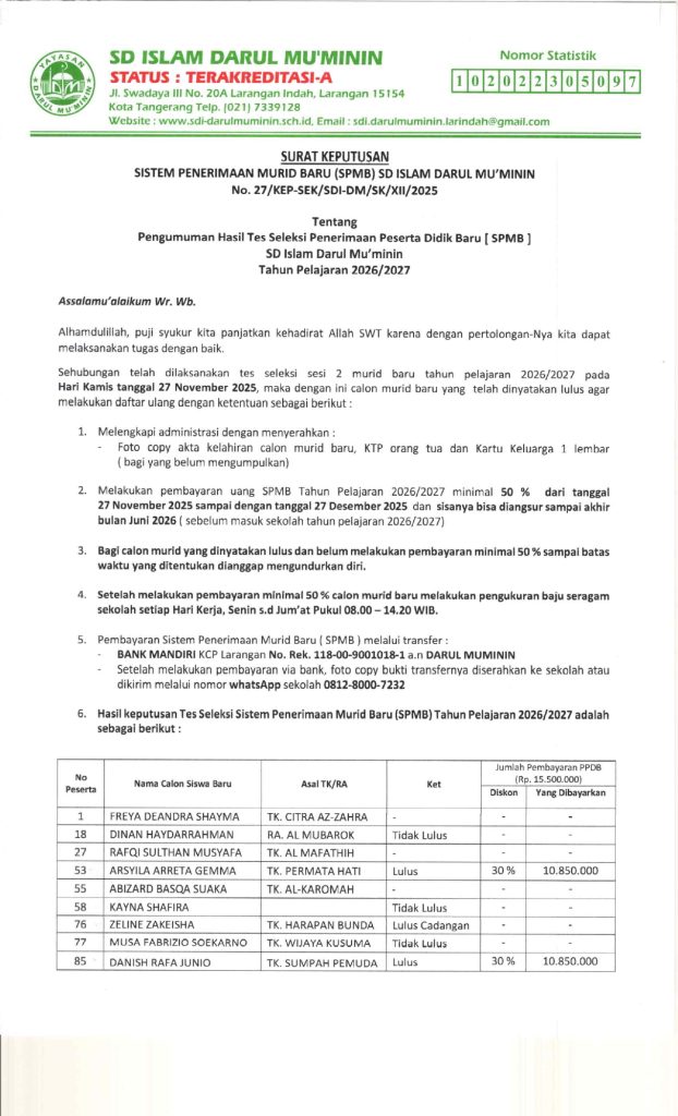 Hasil Seleksi Sistem Penerimaan Murid Baru Tahun Pelajaran 2026-2027 Gelombang 2 Desember 1, 2025Desember 1, 2025 administrator